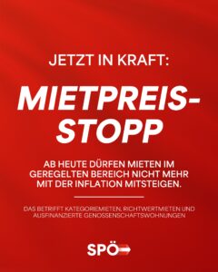 Der von der Bundesregierung vorgelegte und in der ersten Nationalratssitzung nach der Angelobung beschlossene Mietpreis-Stopp für geregelte Mieten greift ab 1. April 2025. Unser Bundesgeschäftsführer Klaus Seltenheim betont, dass der Mietpreis-Stopp Millionen Menschen entlastet: „Wohnen ist ein Grundrecht und muss für alle leistbar sein. Es ist ein großer Erfolg, dass die geregelten Mieten – also die Richtwert- und Kategoriemieten im Altbau, in Gemeindewohnungen und Mieten in ausfinanzierten gemeinnützigen Wohnbauten – heuer nicht steigen werden“, so Seltenheim. Ohne Eingriff wären die Richtwertmieten ab heute um 3 Prozent, die Kategoriemieten um 4,2 Prozent gestiegen.