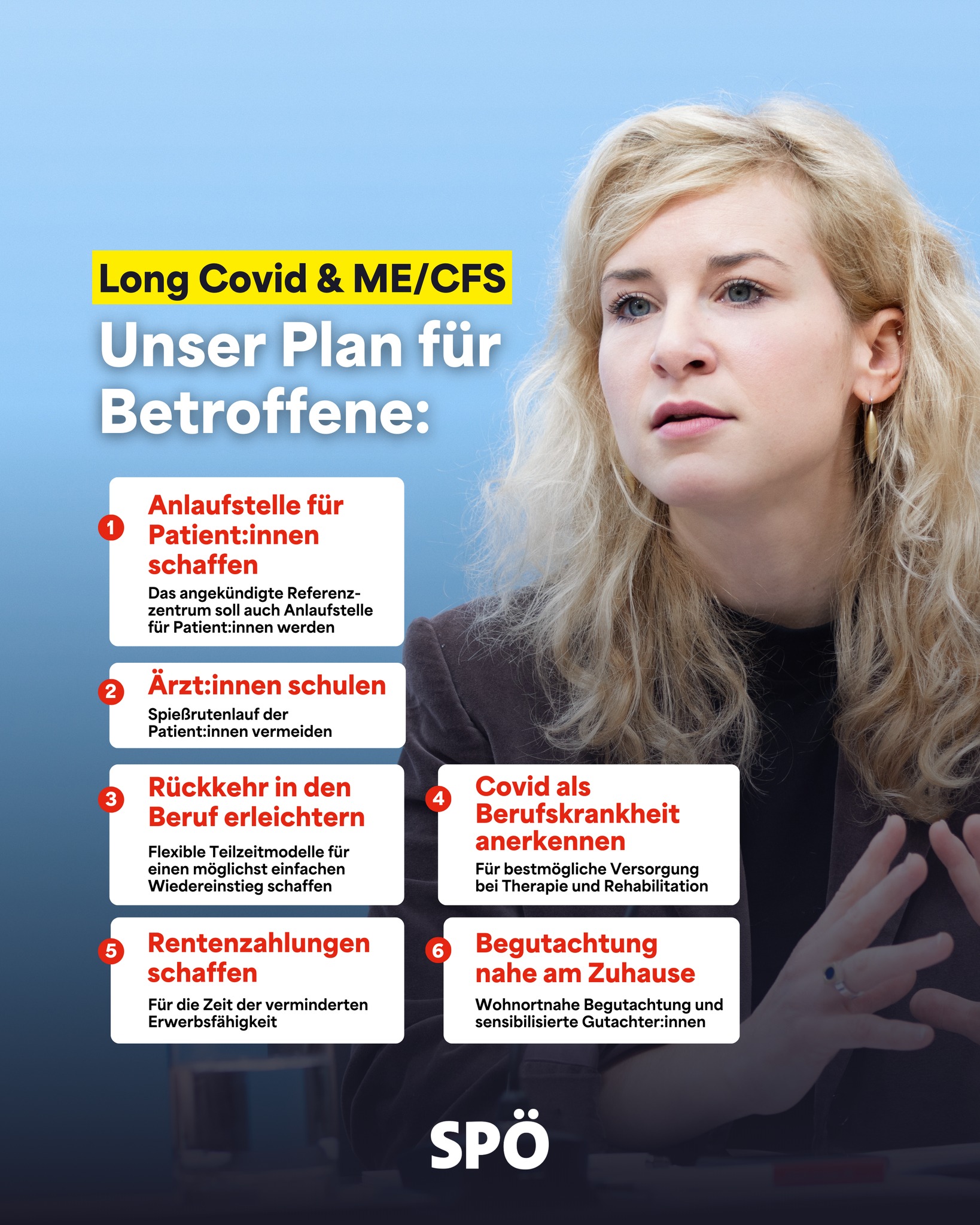 „Long-Covid- und ME/CFS-Patient*innen brauchen eine zentrale Anlaufstelle, wo ihnen geholfen wird. Viele Betroffene fühlen sich im Stich gelassen“, betont Holzleitner und fordert u.a. eine rasche Umsetzung des vom Gesundheitsminister angekündigten Referenzzentrums sowie eine Anerkennung von Covid als Berufskrankheit in allen Branchen.