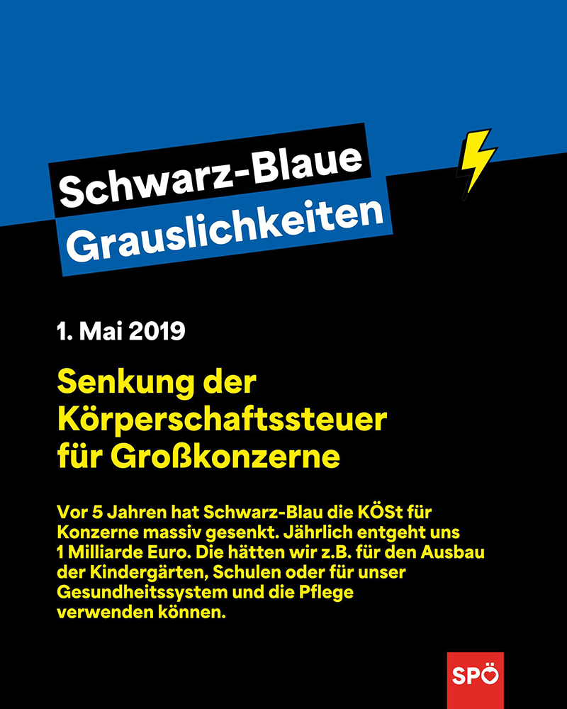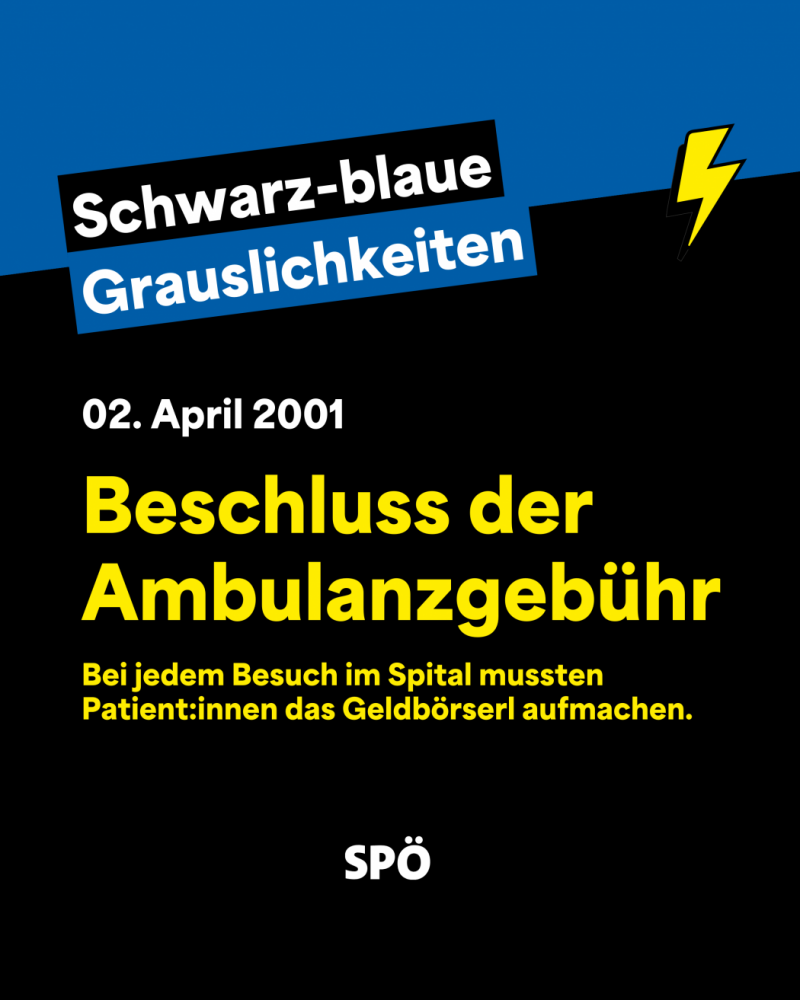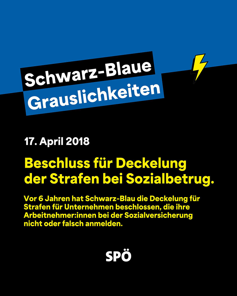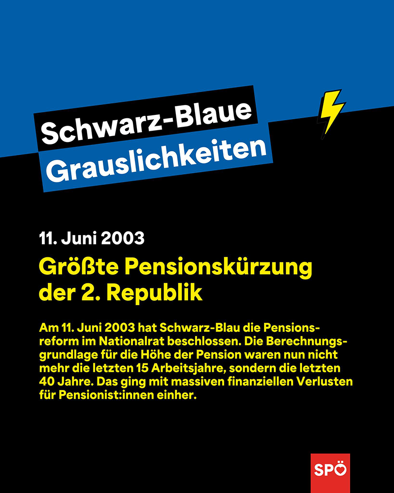 Massive Pensionskürzungen, Zerschlagung unseres Gesundheitssystems, Einführung der 60-Stunden-Woche: Die Liste der Grauslichkeiten von FPÖ und ÖVP in Regierungsverantwortung ist lang. Wir haben deshalb eine neue Aussendungsserie zu schwarz-blauen „Jahrestagen“ gestartet, um an die unsozialen Beschlüsse zu erinnern. Wir zeigen Blau-Schwarz die Rote Karte und stellen klar, dass eine weitere Koalition aus FPÖ und ÖVP verhindert werden muss. Klar ist auch: Nur eine starke SPÖ kann eine Neuauflage der Schreckenskoalition verhindern!