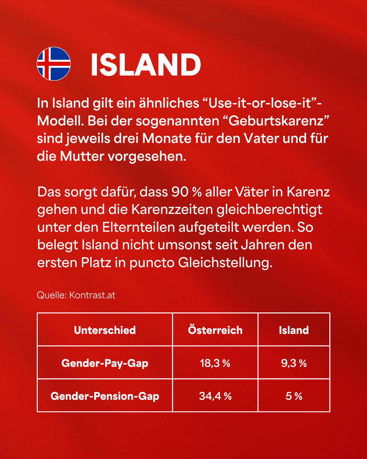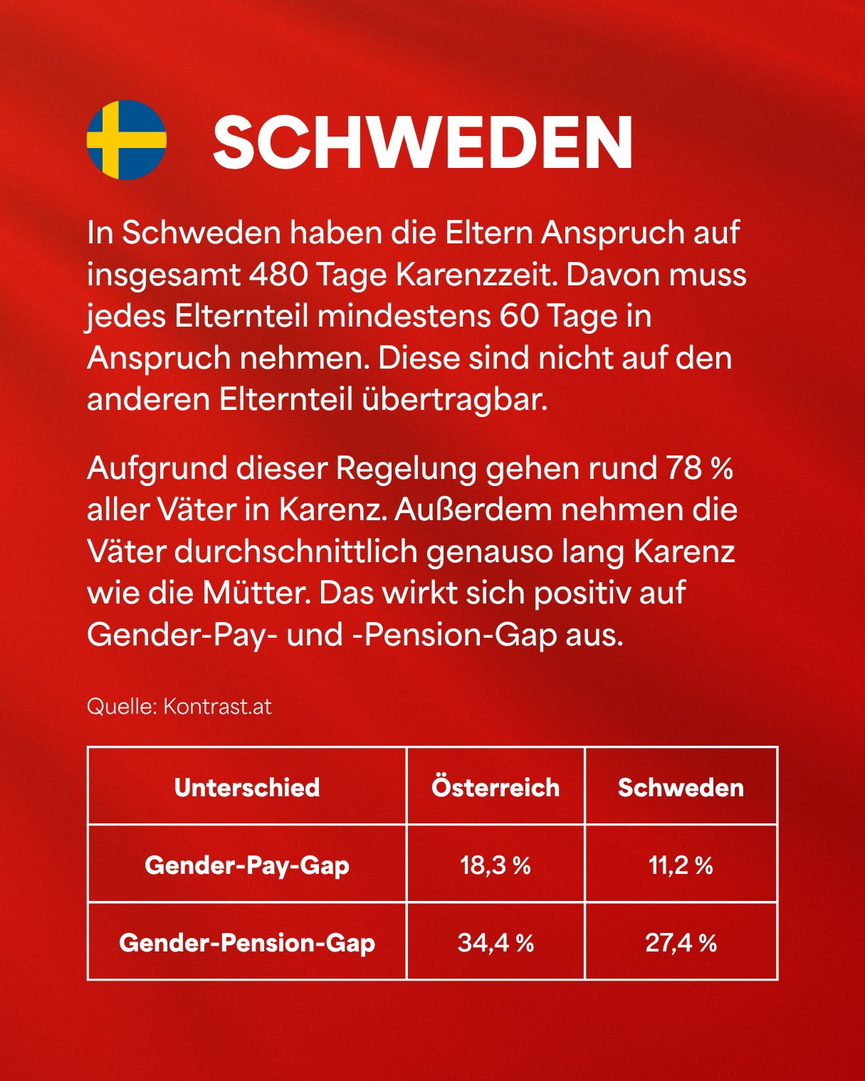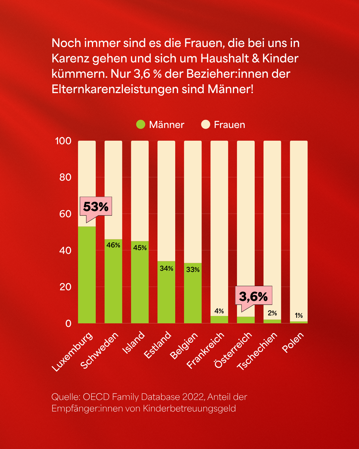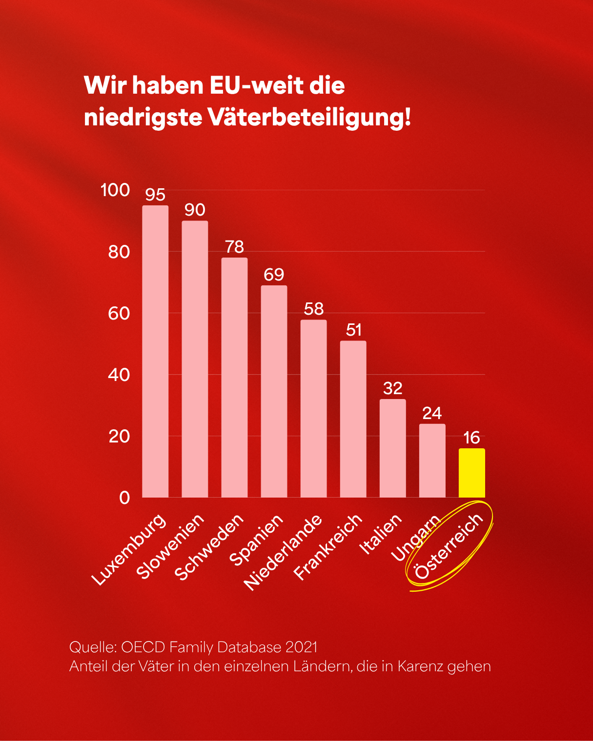 In Staaten wie Schweden oder Island ist die Karenzzeit von Vätern längst selbstverständlich. Hierzulande bleiben die meisten Männer nach wie vor im Beruf, während Frauen den Großteil der Kinderbetreuung übernehmen. Obwohl Studien klar zeigen, dass eine höhere Väterbeteiligung z.B. zu geringeren Einkommensunterschieden führt, geht in Österreich nicht einmal jeder sechste Vater (16 Prozent) in Karenz. Damit liegt unser Land am Ende der europäischen Rangliste, wenn es um Väterbeteiligung geht.