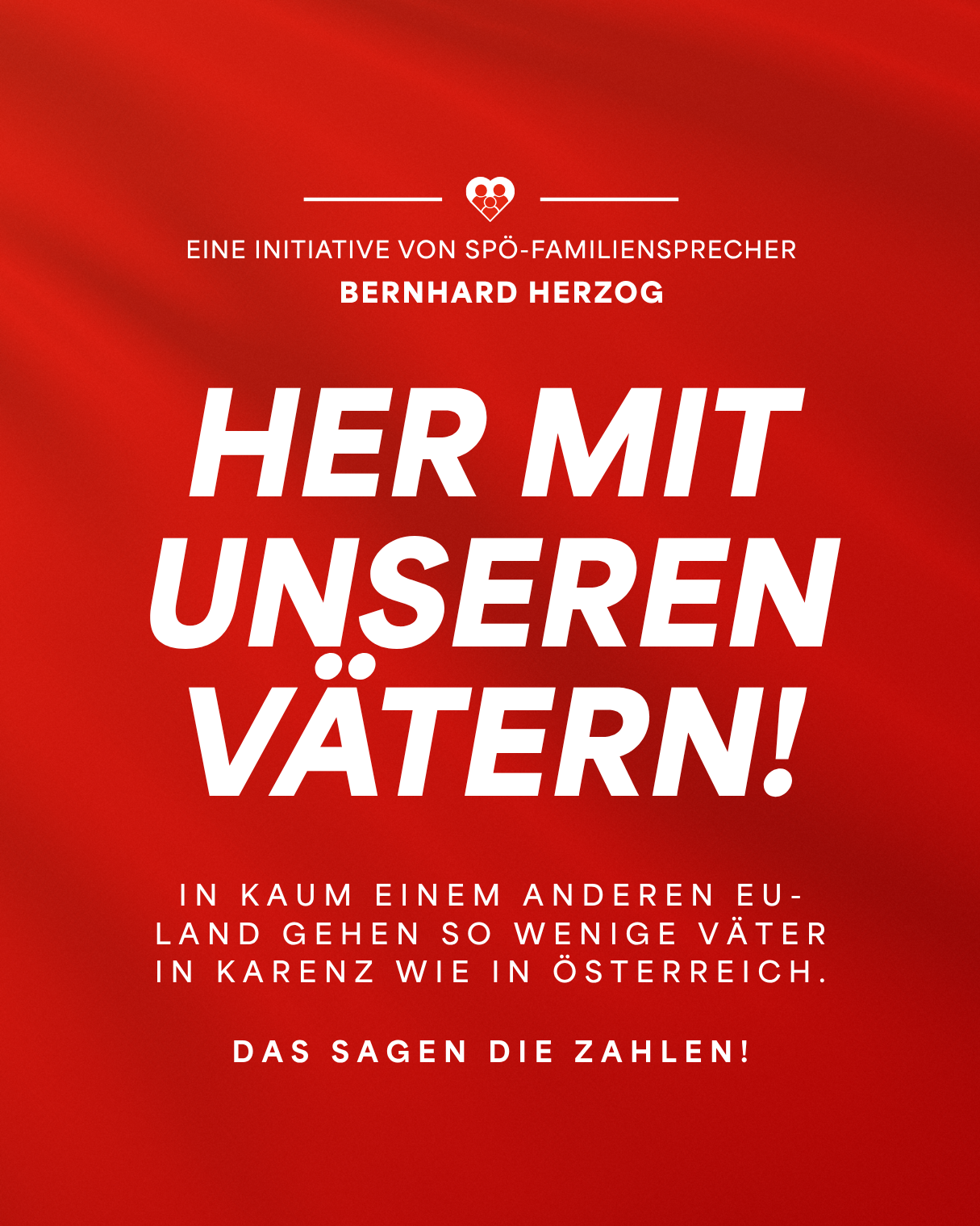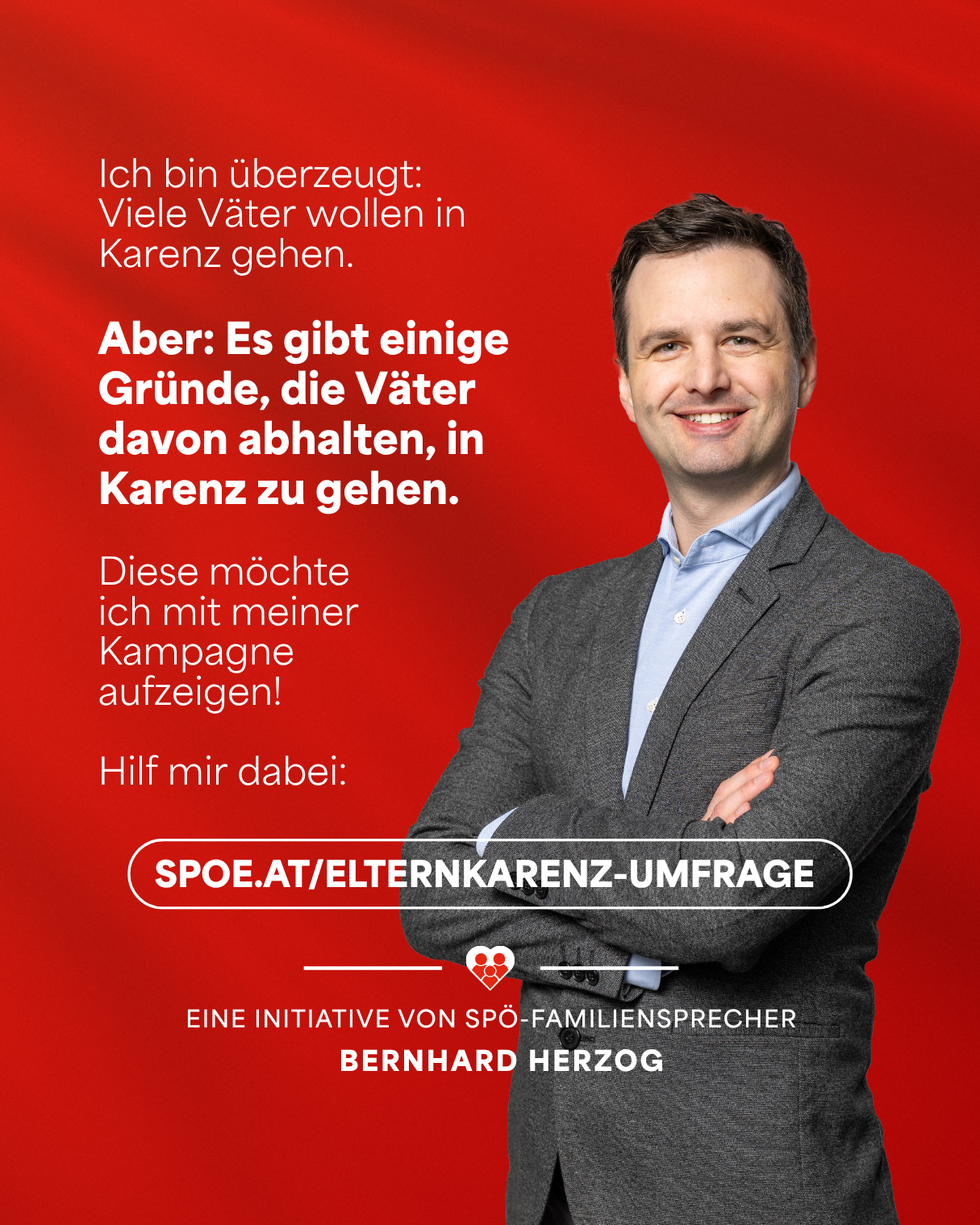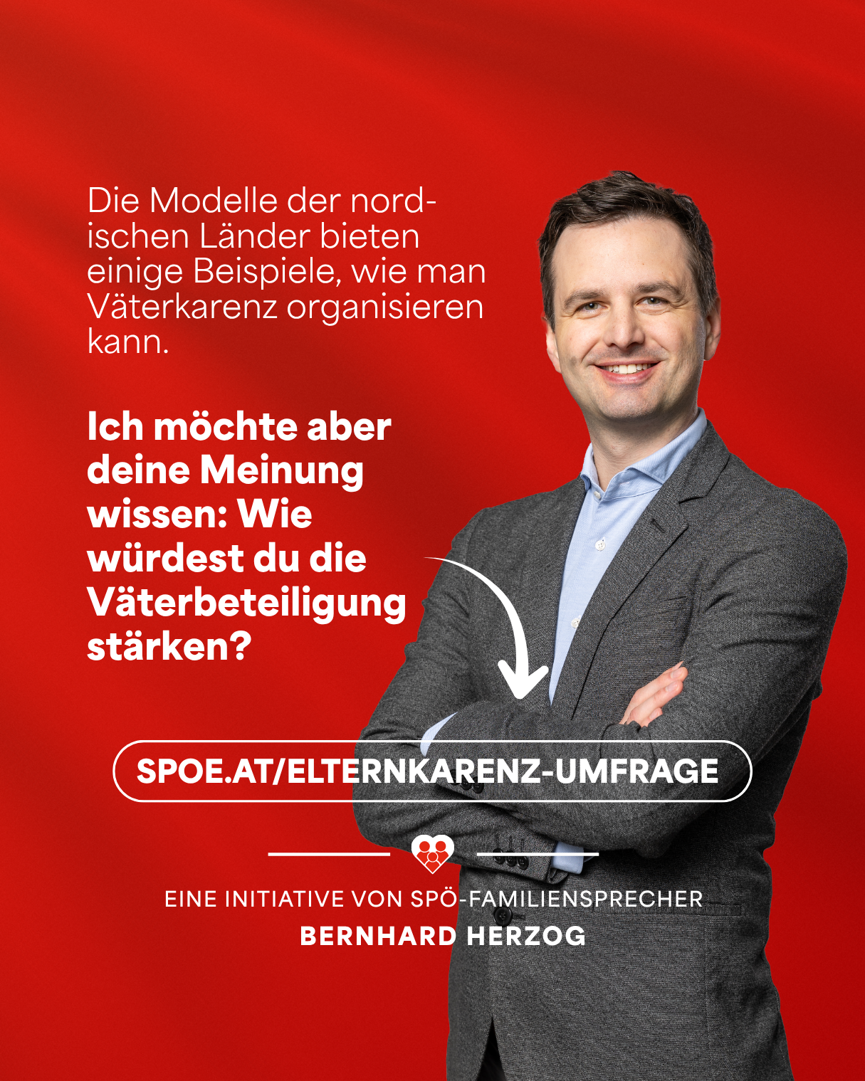 Österreich ist EU-Schlusslicht bei der Väterkarenz. Das hat verschiedene Gründe. Um Hindernisse aufzuzeigen und Erfahrungen von Eltern sichtbar zu machen, startet SPÖ-Familiensprecher Bernhard Herzog deshalb eine Online-Umfrage. Auf Basis der Ergebnisse werden anschließend Vorschläge für mehr Väterbeteiligung erarbeitet.