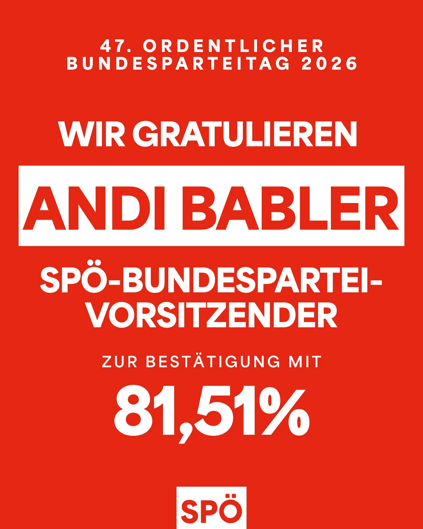 Andreas Babler wurde am Samstag mit starken 81,51 Prozent als SPÖ-Bundesparteivorsitzender wiedergewählt. „Vielen Dank für euer Vertrauen, über vier Fünftel Zustimmung, das ist ein starkes Zeichen! Wir fokussieren uns ab morgen darauf, weiter gegen die Teuerung und für eine gute Gesundheitsversorgung zu kämpfen. Danke, dass ihr uns heute gestärkt habt, damit wir mit voller Kraft diese Themen umsetzen können“, so Babler nach der Ergebnisverkündung.